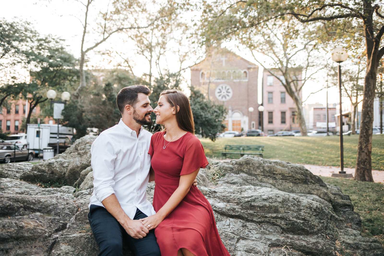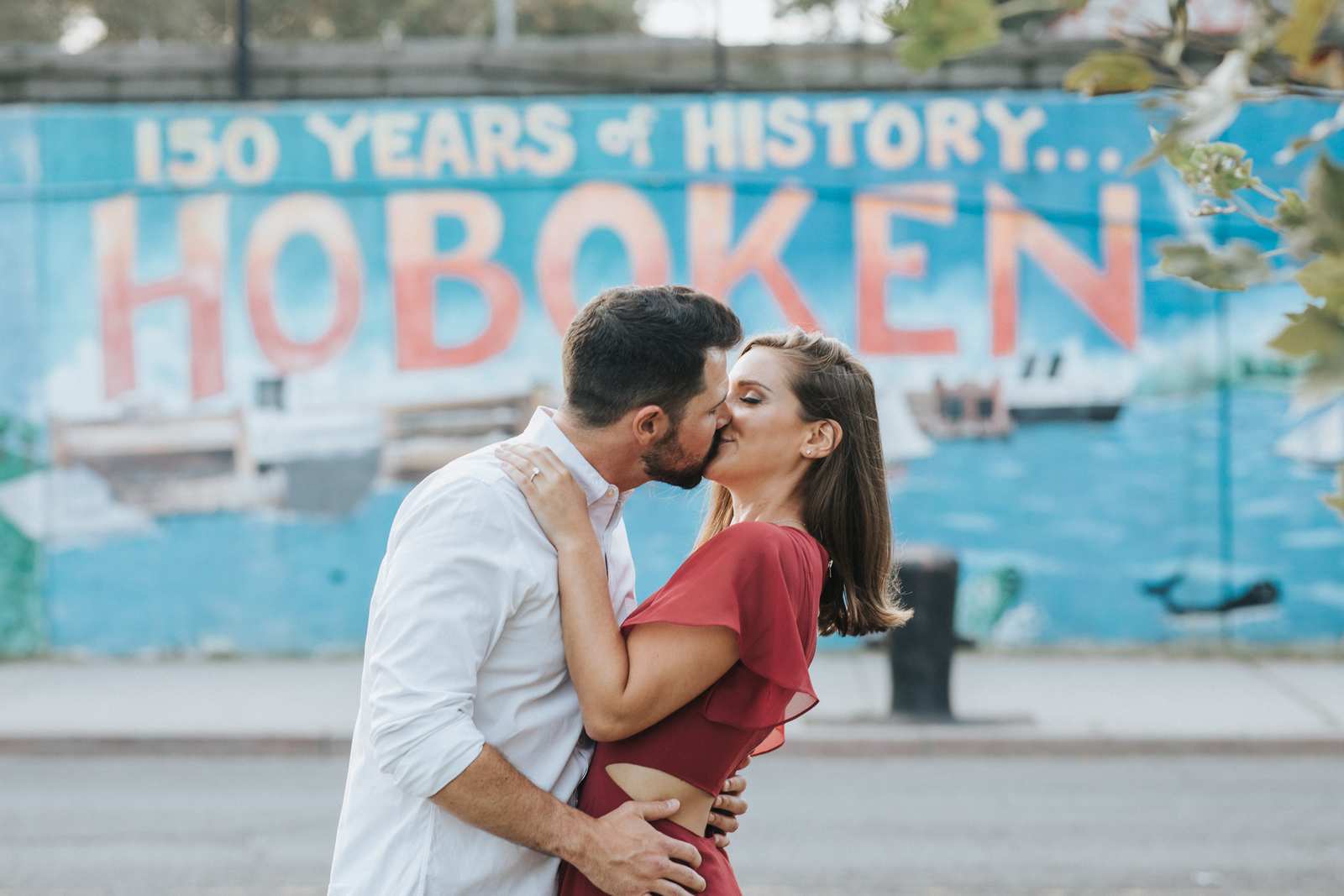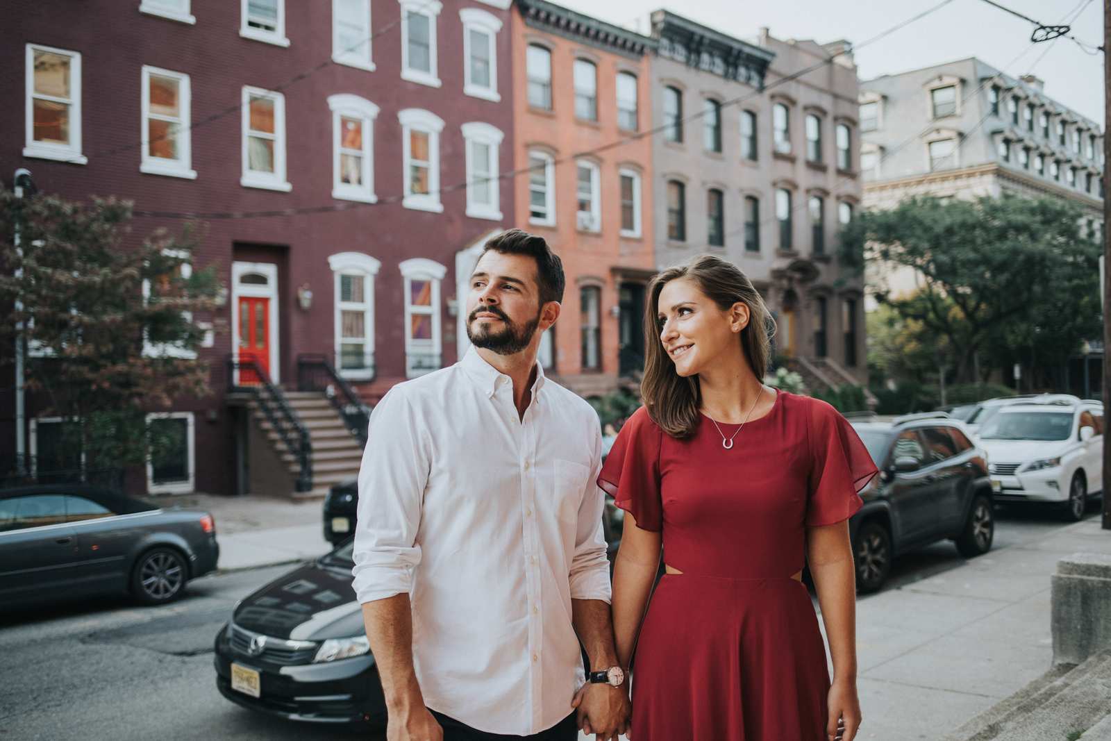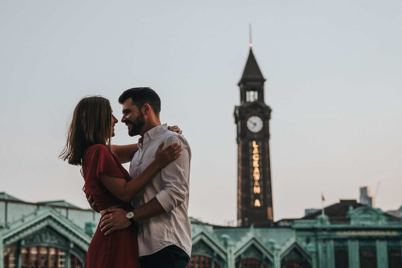 Hoboken is always an amazing spot for engagement photos as a town with a great vibe of its own but also because of the views of NYC. There are so many of options all within a short walk of the waterfront area that there is something for everyone who wants the urban feel. We met the couple and began photographing at the pier parks which extend into the Hudson River. We love using them every time we are in Hoboken because they provide completely unobstructed views of the New York City skyline but still keep a traditional park setting with pathways, benches, and more. We then made our way uptown towards the Stevens Institute and onto the streets lined with colorful brownstones as the sun began to see in the distance. Nearby we found another of our favorites – Court Street which is still paved with cobblestones from when the city was originally built. The quaint buildings and gardens there were the perfect backdrop before walked back to the waterfront once again. There we found the Lackawanna Terminal tower beautifully lit up for some last few photos with the last bit of light still in the sky! We loved capturing the connection and love between this pair and cannot wait to photograph their wedding at Perona Farms next year.