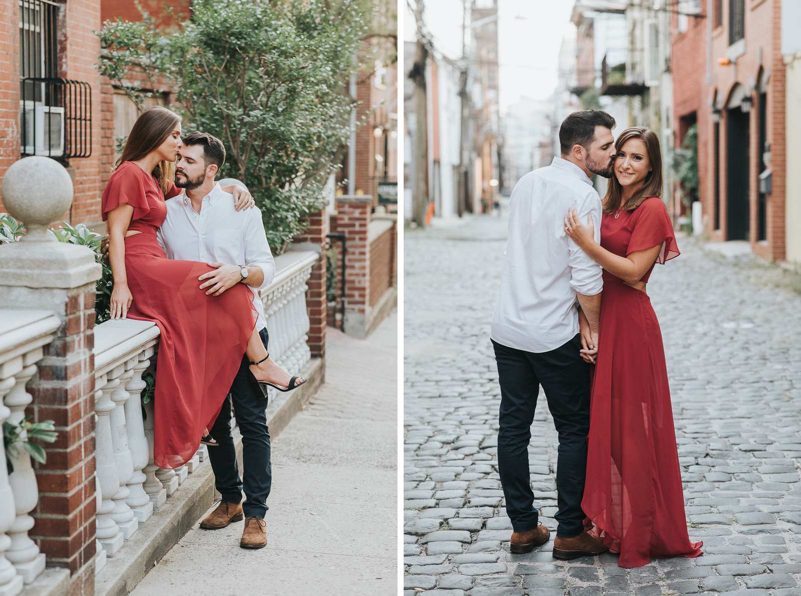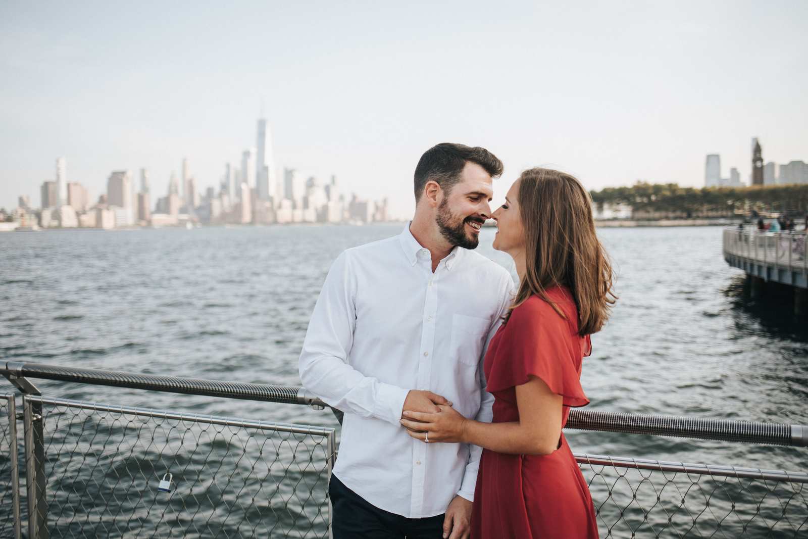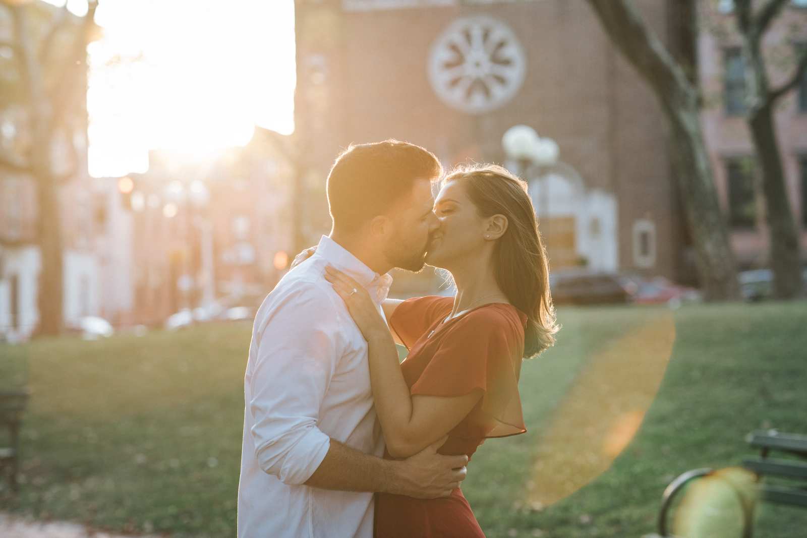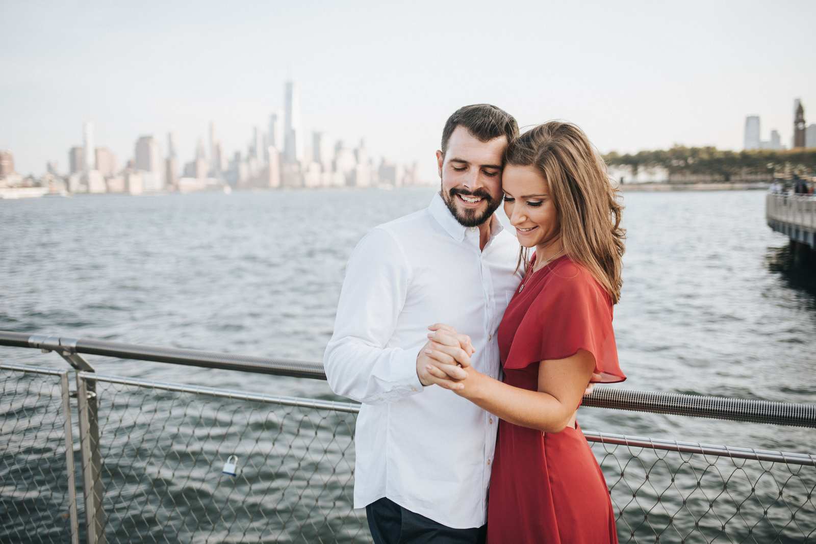 Hoboken is always an amazing spot for engagement photos as a town with a great vibe of its own but also because of the views of NYC. There are so many of options all within a short walk of the waterfront area that there is something for everyone who wants the urban feel. We met the couple and began photographing at the pier parks which extend into the Hudson River. We love using them every time we are in Hoboken because they provide completely unobstructed views of the New York City skyline but still keep a traditional park setting with pathways, benches, and more. We then made our way uptown towards the Stevens Institute and onto the streets lined with colorful brownstones as the sun began to see in the distance. Nearby we found another of our favorites – Court Street which is still paved with cobblestones from when the city was originally built. The quaint buildings and gardens there were the perfect backdrop before walked back to the waterfront once again. There we found the Lackawanna Terminal tower beautifully lit up for some last few photos with the last bit of light still in the sky! We loved capturing the connection and love between this pair and cannot wait to photograph their wedding at Perona Farms next year.