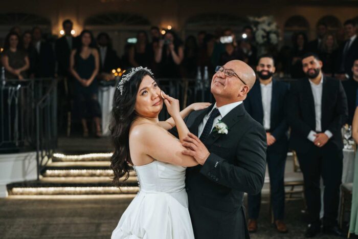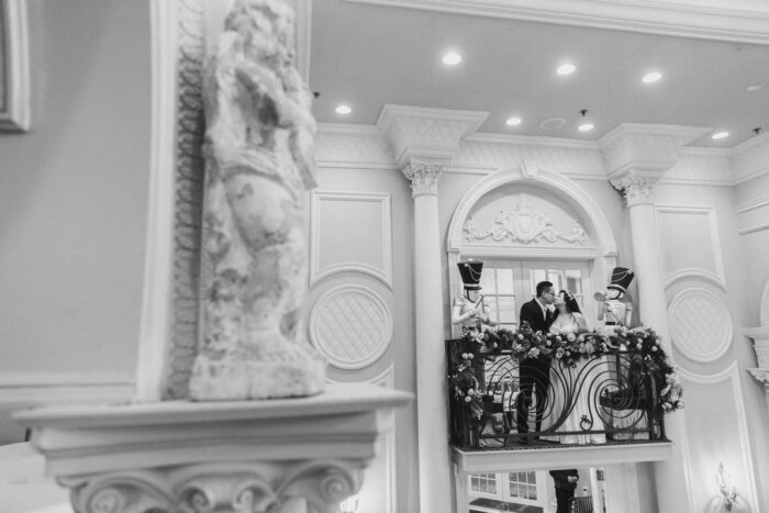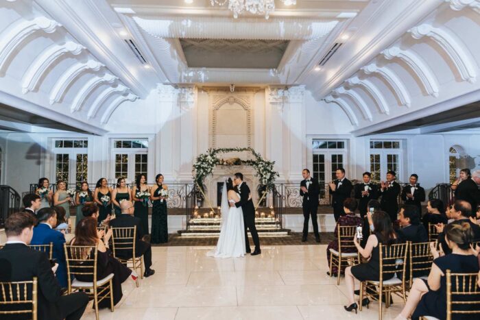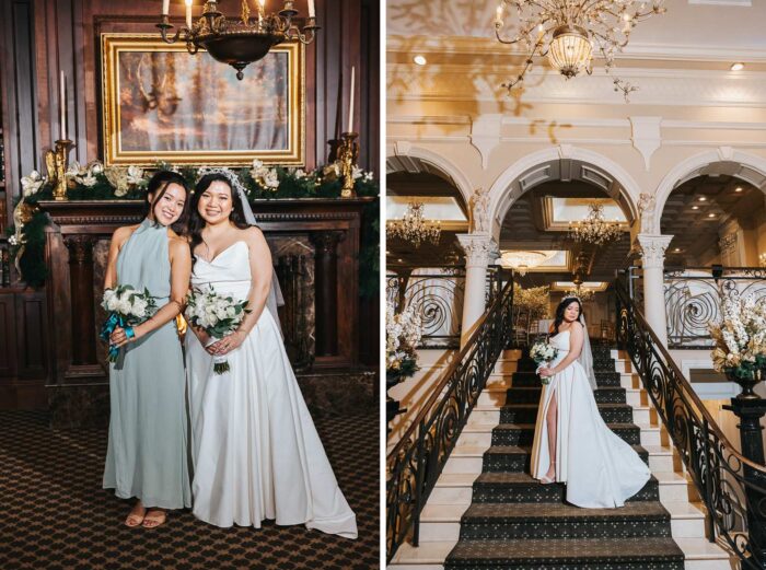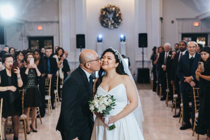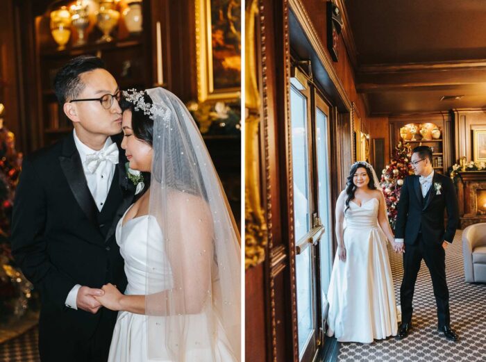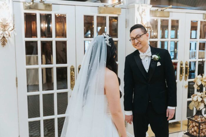 After a super emotional first look with her father, the couple did their first look together in the main foyer to stay dry and warm just a bit longer!