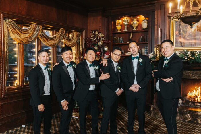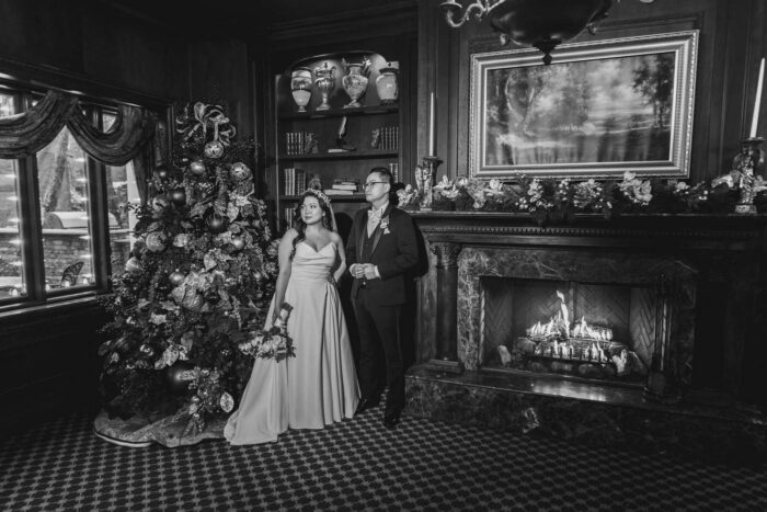 Warming up by the fireplace and a couple more portrait style photos of the couple and then the groomsmen and bridesmaids.