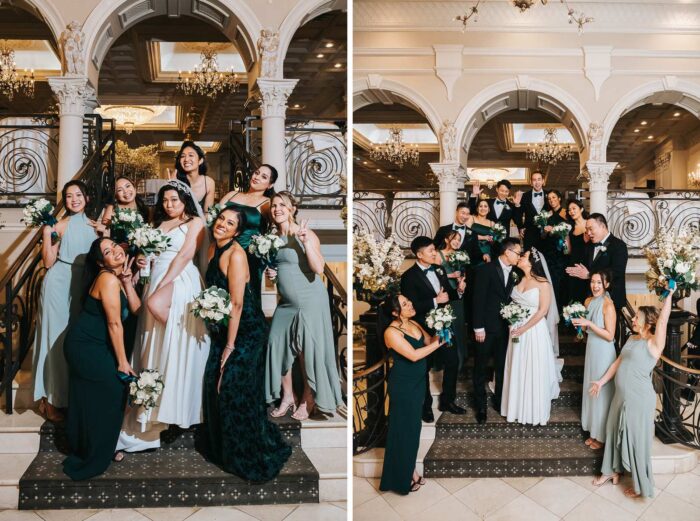 Bridal party group photos on the staircase leading in the cocktail hour space