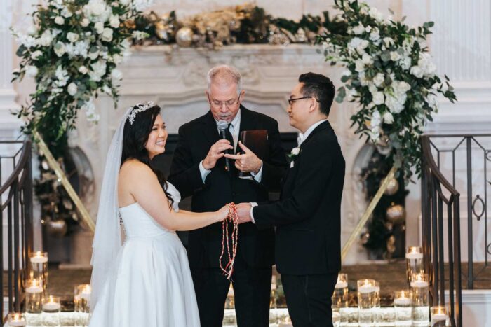 The ceremony begins with the groom walking down the aisle soon followed by the bride. After exchanging vows, rings, and a kiss they are officially married.