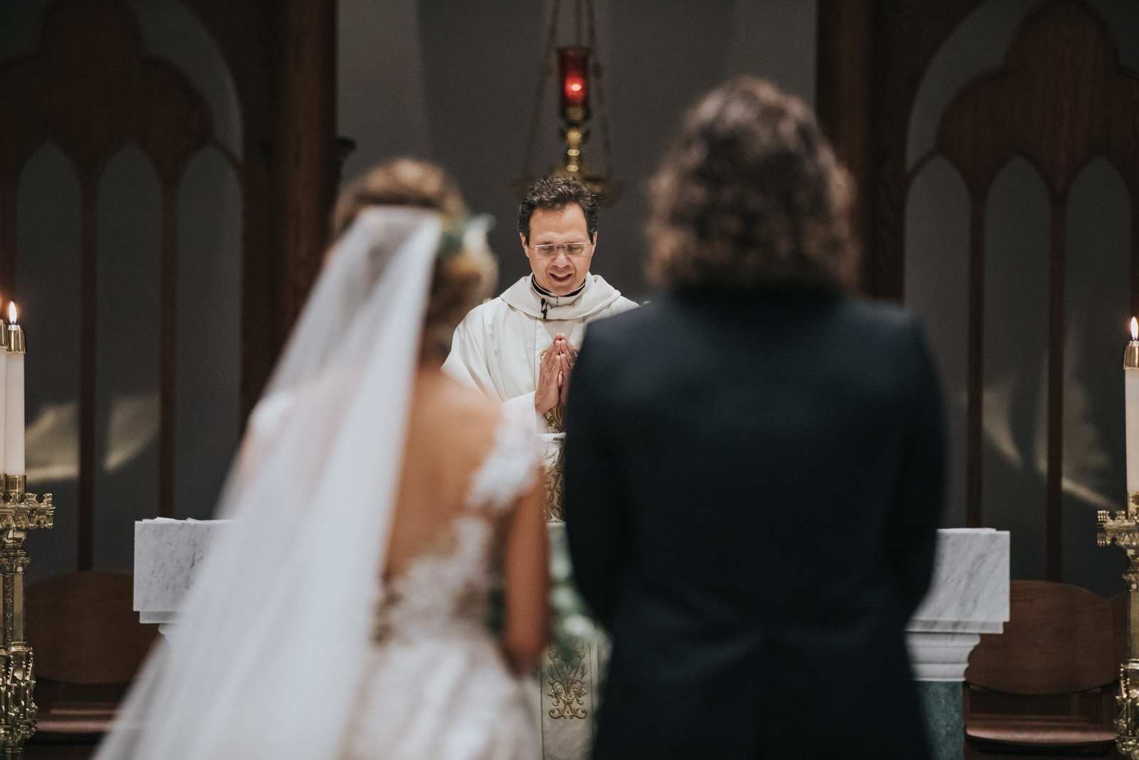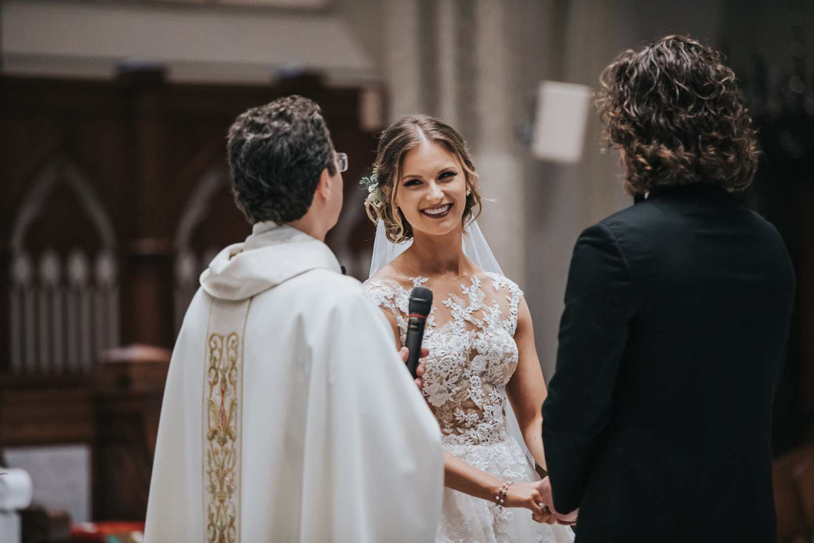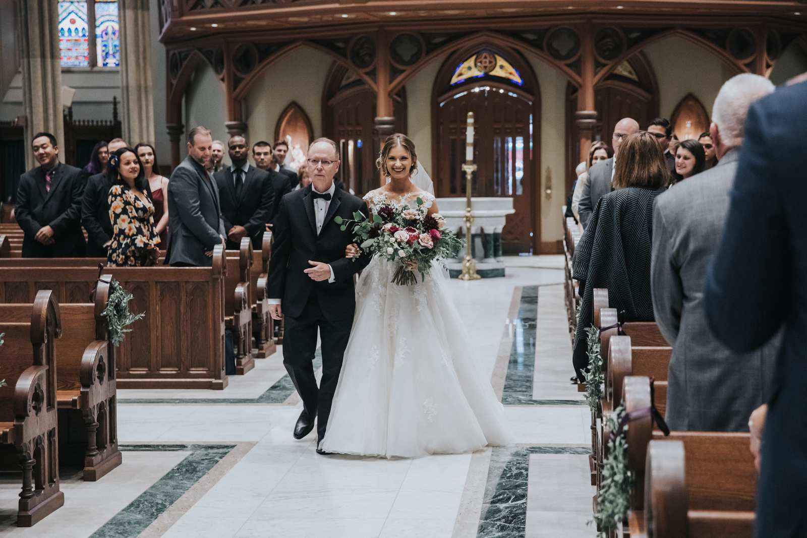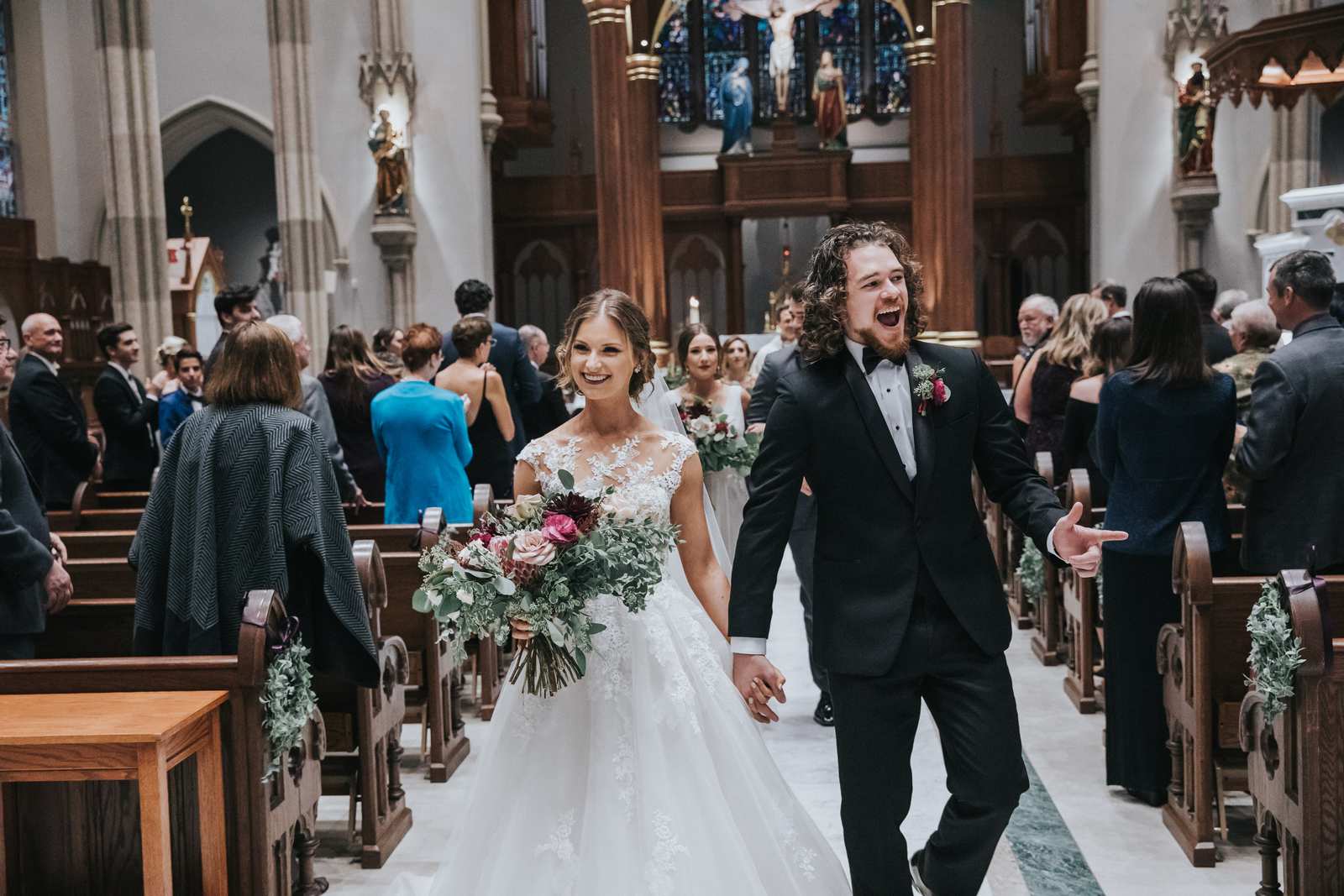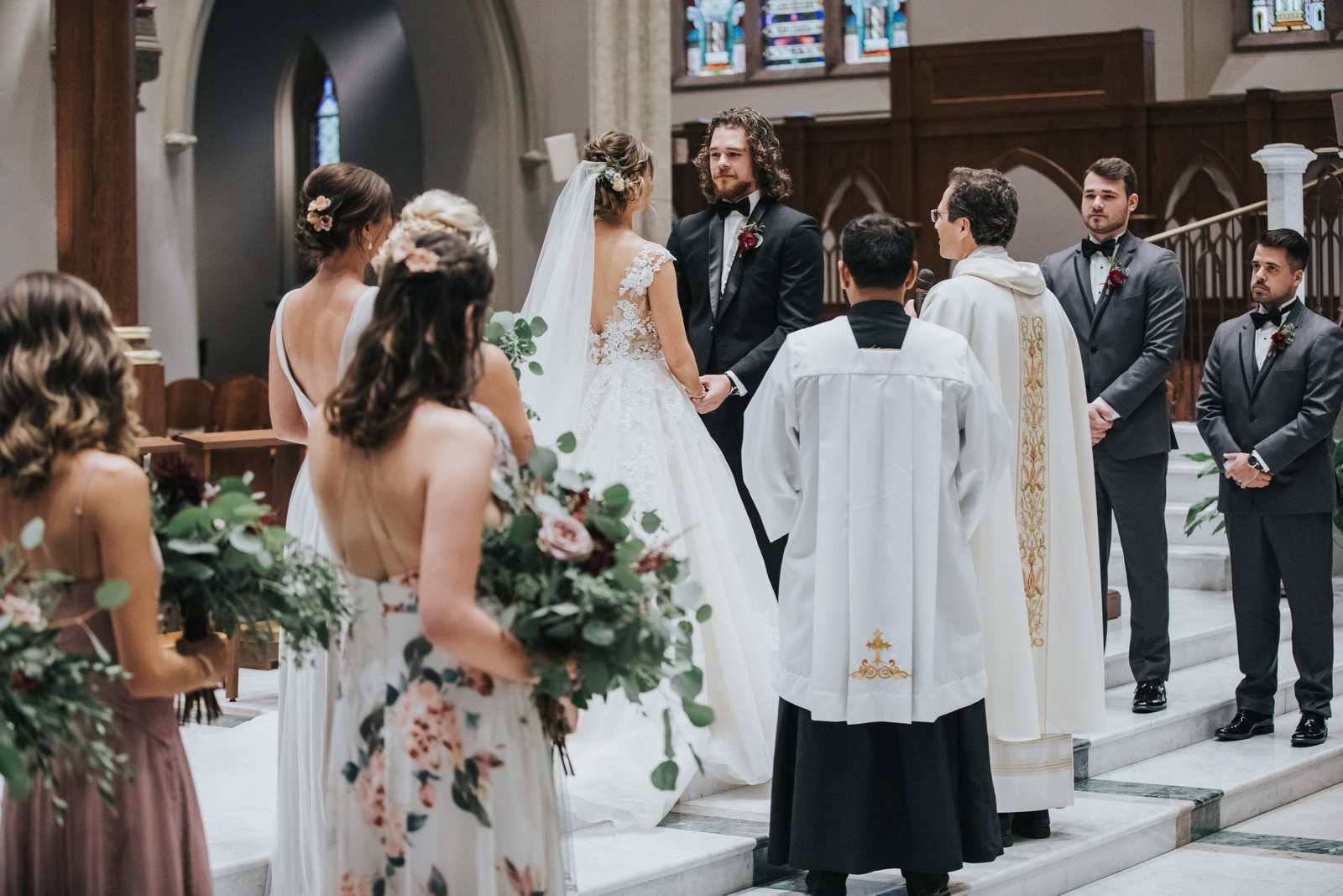 We began capturing all of the candid moments in the bridal suite from the end of the hair and makeup process and right through a first look with the brides father and brothers involving a stick on mustache. After some bridal party photos in the courtyard, we headed to main street in Paterson to the for a more traditional but also awe inspiring ceremony location at St John the Baptist Roman Catholic Cathedral. The massive Cathedral was a grand backdrop for the ceremony and we loved capturing different angles showing off both the architecture and couple throughout the nuptials and following mass.