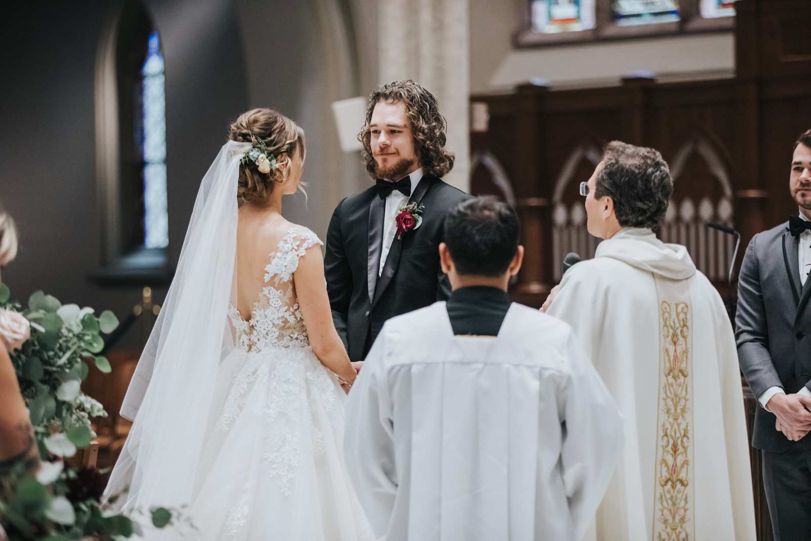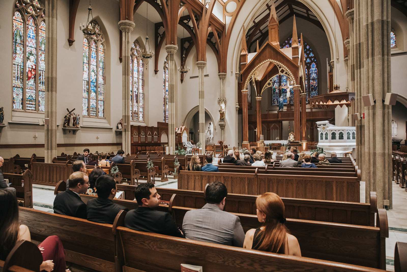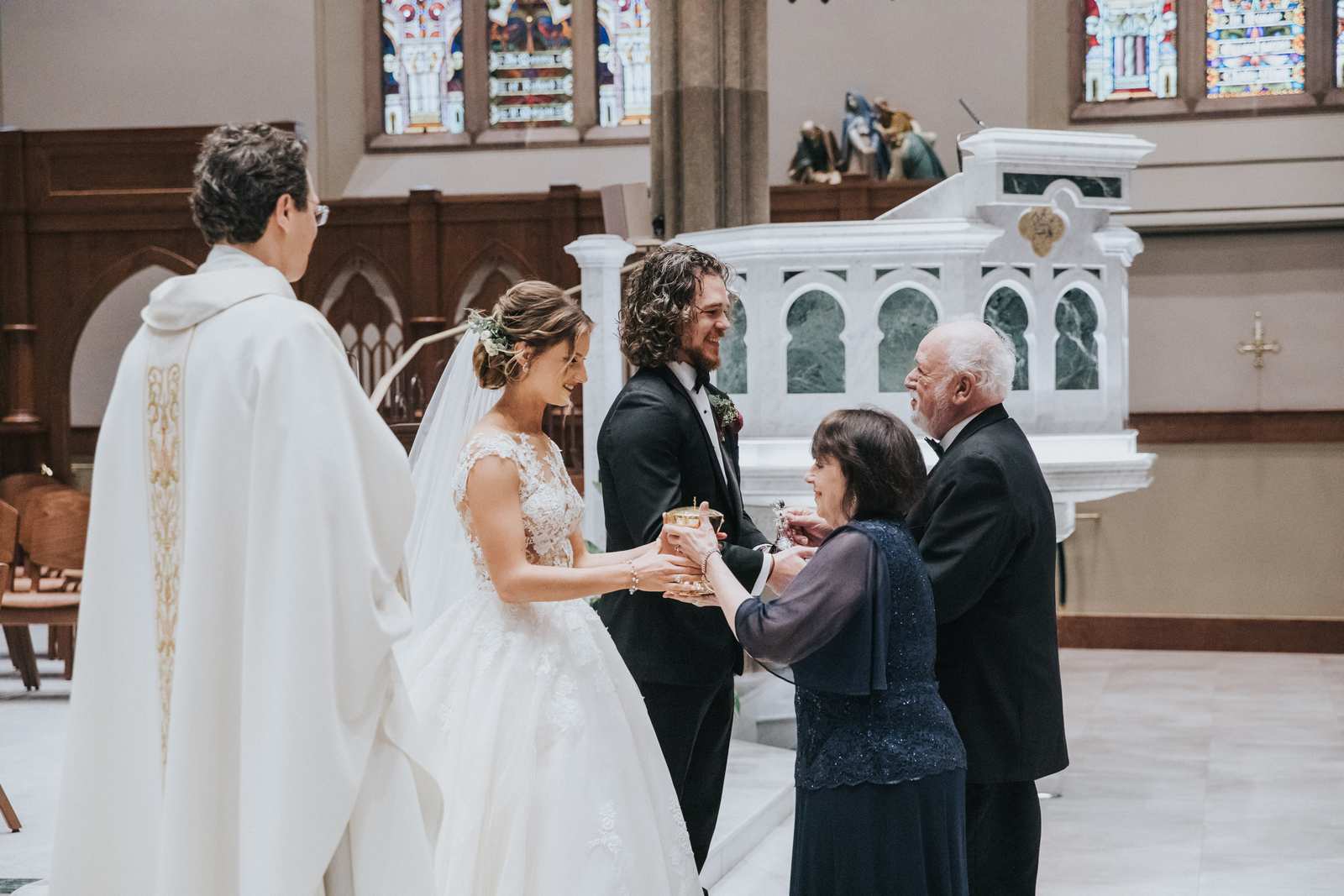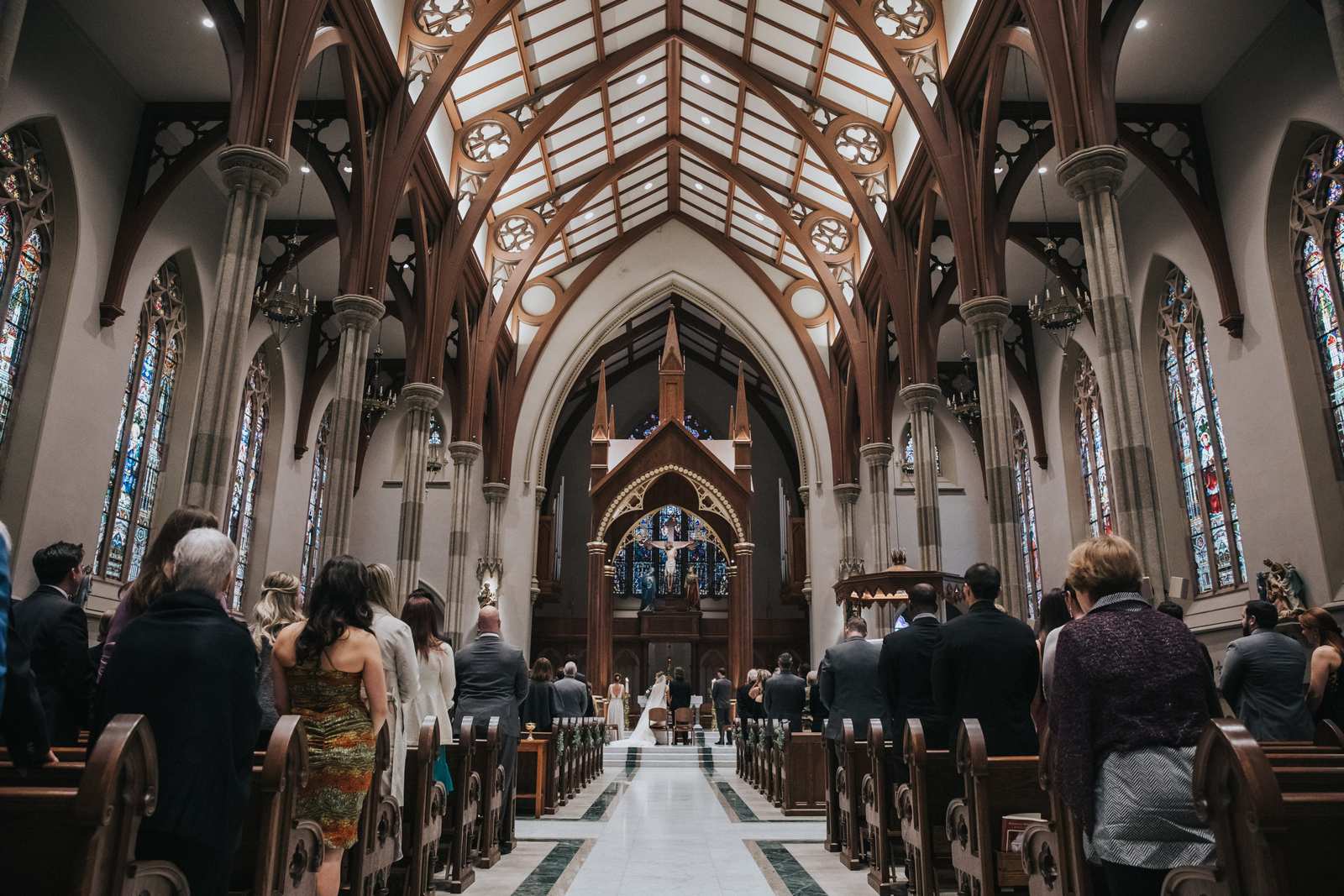 We began capturing all of the candid moments in the bridal suite from the end of the hair and makeup process and right through a first look with the brides father and brothers involving a stick on mustache. After some bridal party photos in the courtyard, we headed to main street in Paterson to the for a more traditional but also awe inspiring ceremony location at St John the Baptist Roman Catholic Cathedral. The massive Cathedral was a grand backdrop for the ceremony and we loved capturing different angles showing off both the architecture and couple throughout the nuptials and following mass.