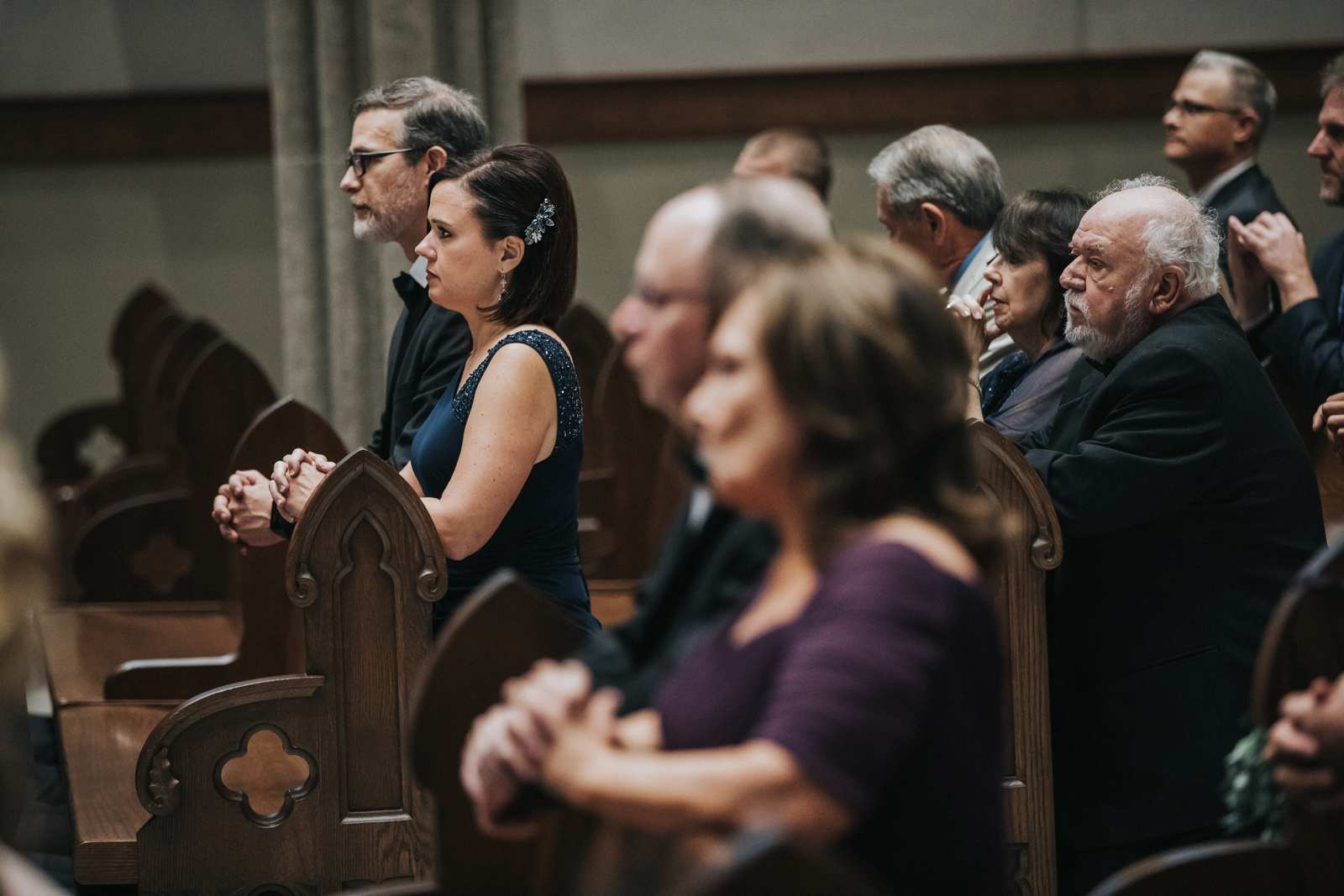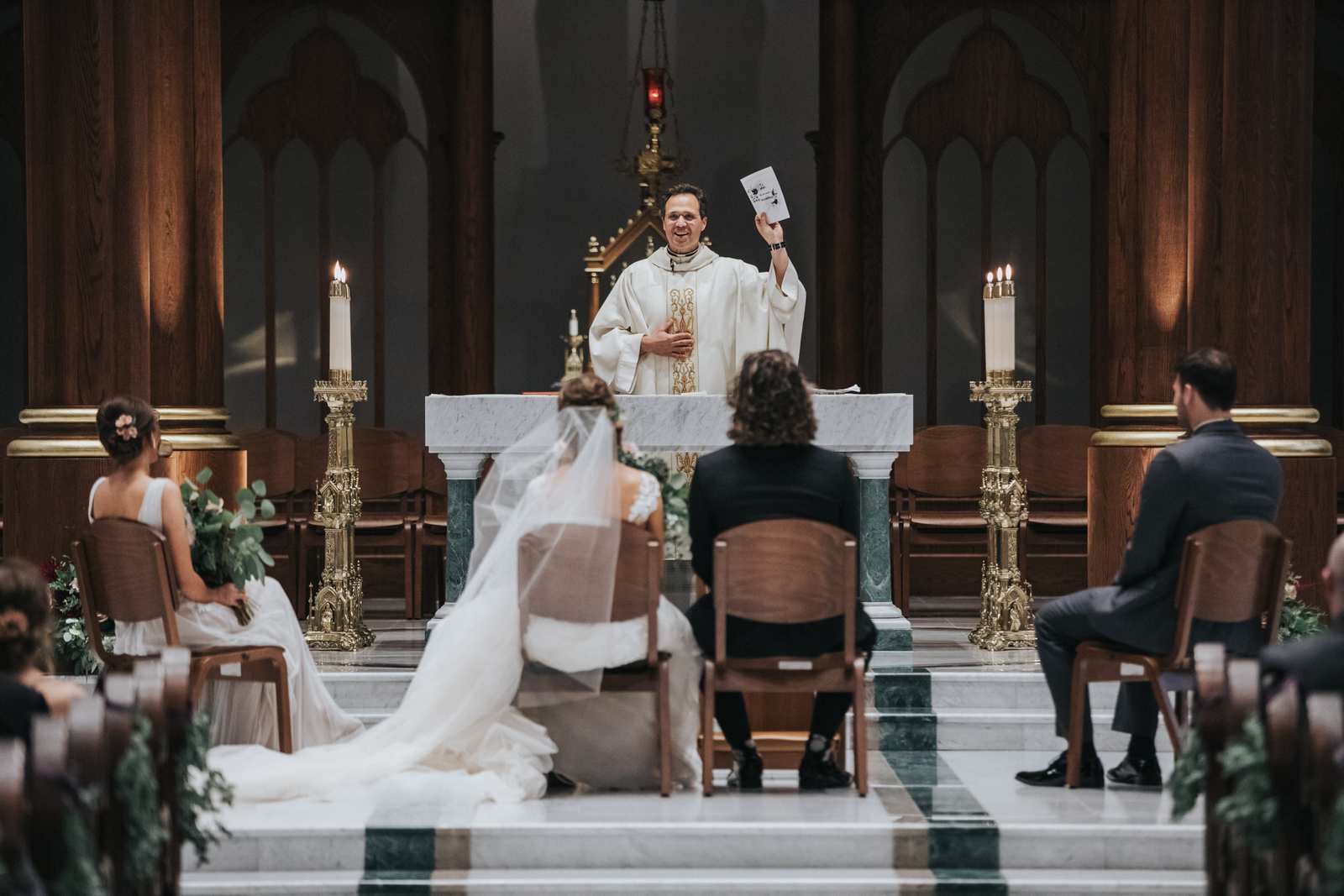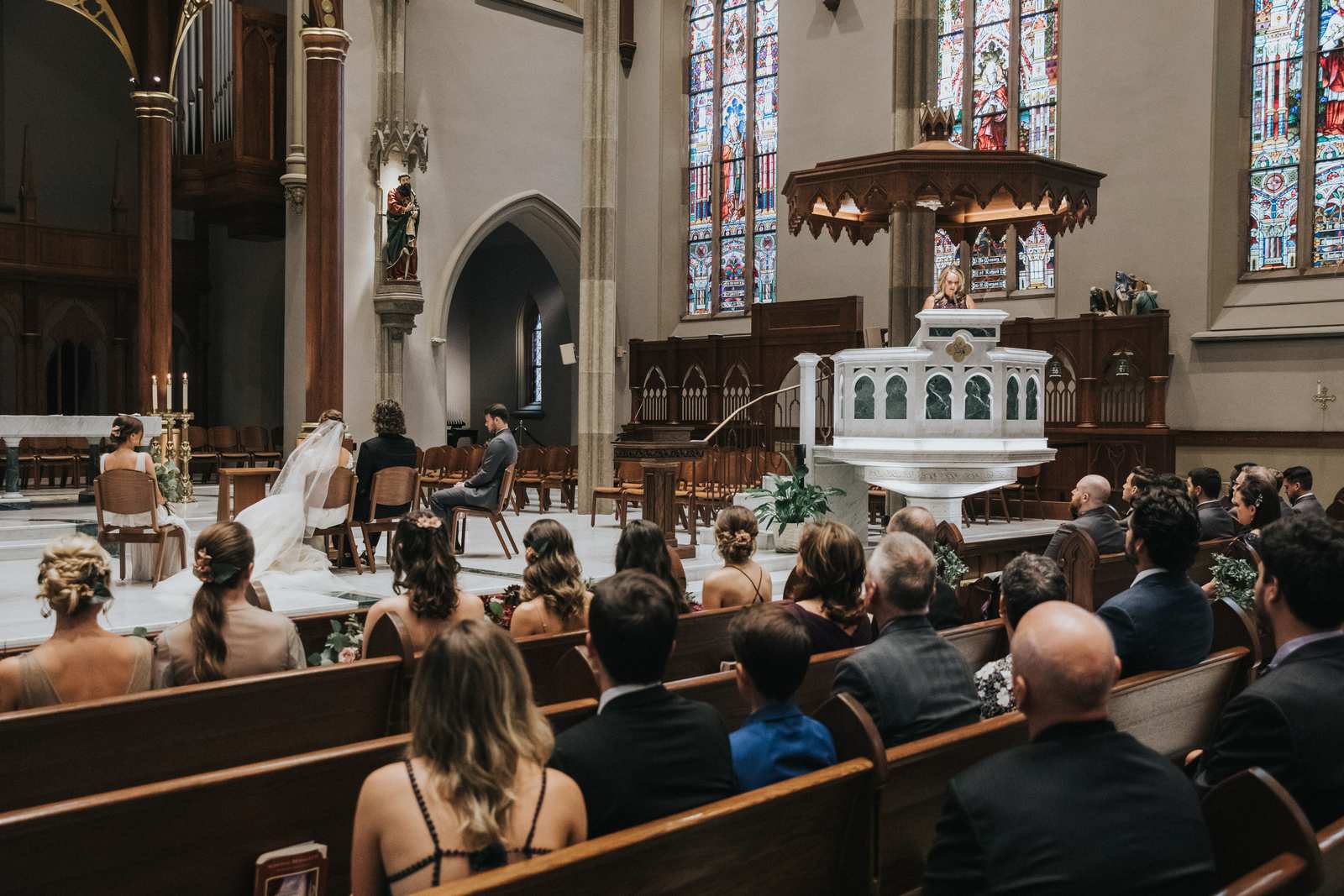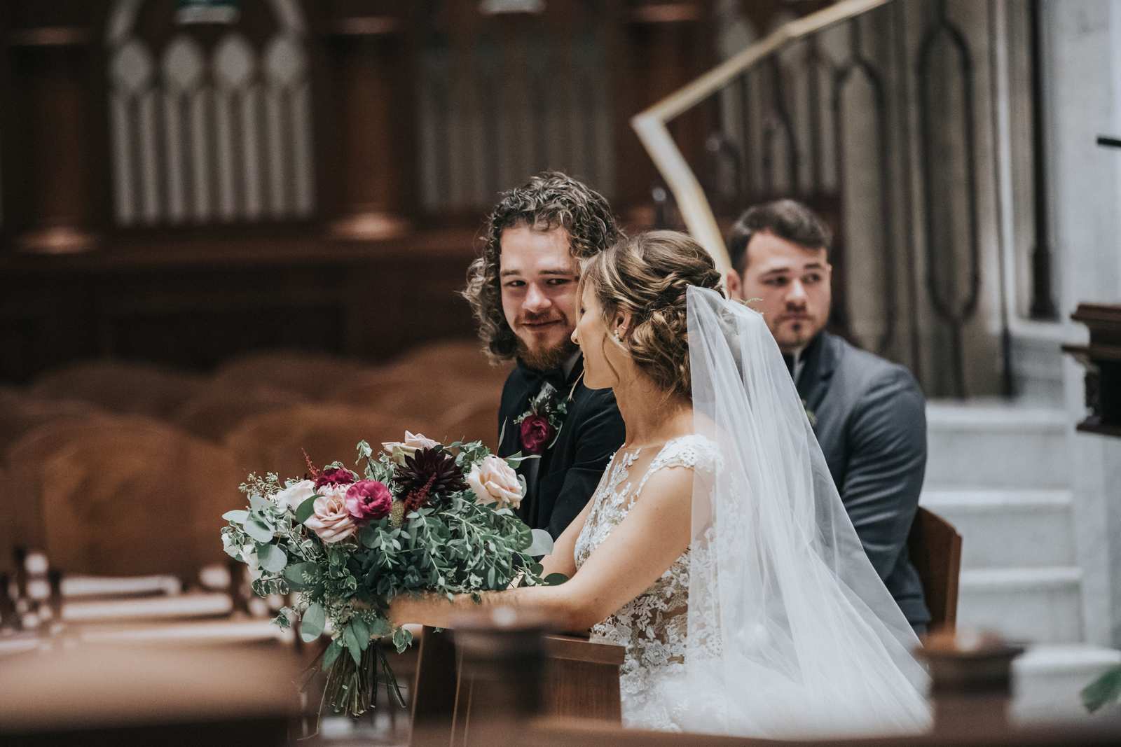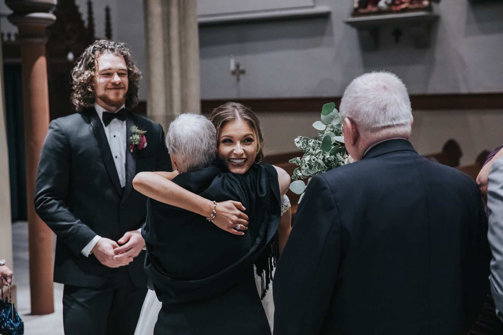 We began capturing all of the candid moments in the bridal suite from the end of the hair and makeup process and right through a first look with the brides father and brothers involving a stick on mustache. After some bridal party photos in the courtyard, we headed to main street in Paterson to the for a more traditional but also awe inspiring ceremony location at St John the Baptist Roman Catholic Cathedral. The massive Cathedral was a grand backdrop for the ceremony and we loved capturing different angles showing off both the architecture and couple throughout the nuptials and following mass.